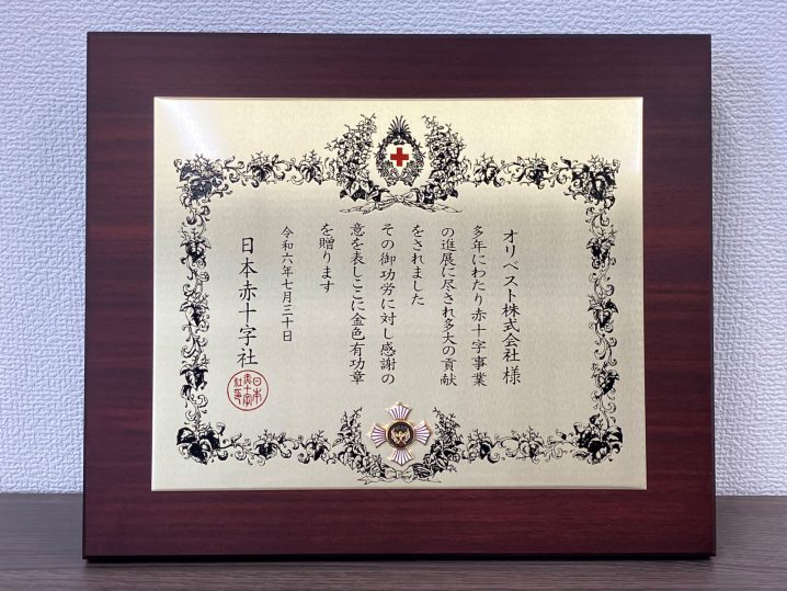 2024.08.01 お知らせ 日本赤十字社より『金色有功章』を受章しました 2024年7月30日、日本赤十字社『金色有功章』を受章しました。 これは長年にわたって献血活動を継続している企業・団体・個人に贈られるものです。 オリベスト株式会社では、これまで半年に1度、20年以上にわたり献血活動を実施してまいりました。 今後も地域社会とのより良い関係性の構築を目指し、献血活動をはじめとした地域貢献活動を推進してまいります。