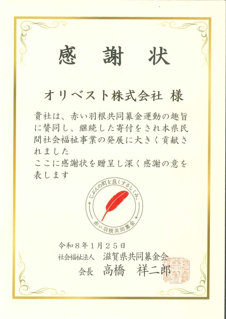 2026.03.23 お知らせ 滋賀県共同募金会感謝状を拝受しました 当社は、地域社会への貢献を重要な使命の一つと考え、赤い羽根共同募金への寄付を長年にわたり継続してまいりました。 このたび、その取り組みに対し、滋賀県共同募金会様より感謝状を拝受いたしました。 今後も、地域に根ざした企業として、社会課題の解決と持続可能な地域づくりに貢献できるよう努めてまいります。
